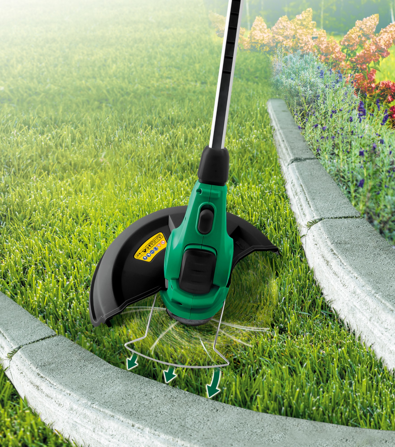 - Regulowana głowica z możliwością obrotu o 90° – idealna do cięcia w narożnikach i pod krzewami.