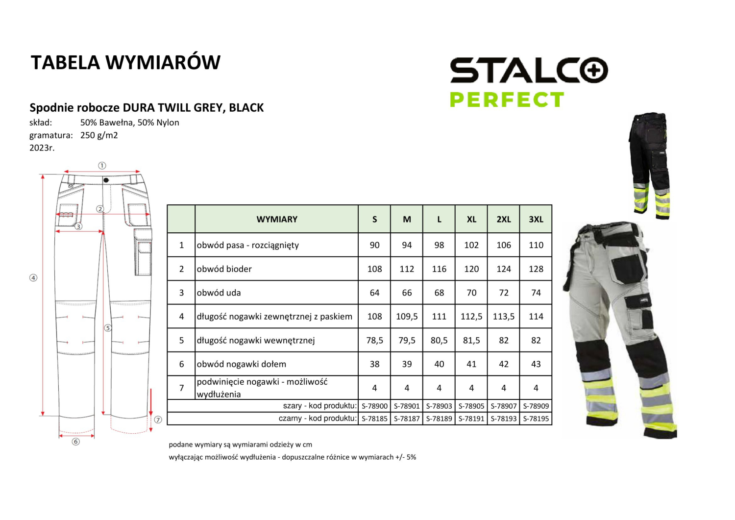 - możliwość wydłużenia nogawek o 4cm