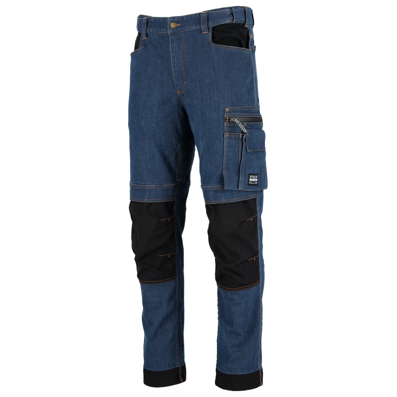 - jeansowe spodnie robocze o kroju klasycznych 5-kieszeniówek